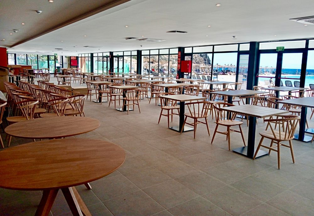 El proyecto incluyó la modernización completa de restaurantes, buffets y cocinas profesionales, incorporando equipamiento de última generación, diseño contemporáneo y materiales resistentes que garantizan eficiencia y estética.