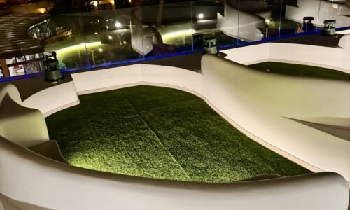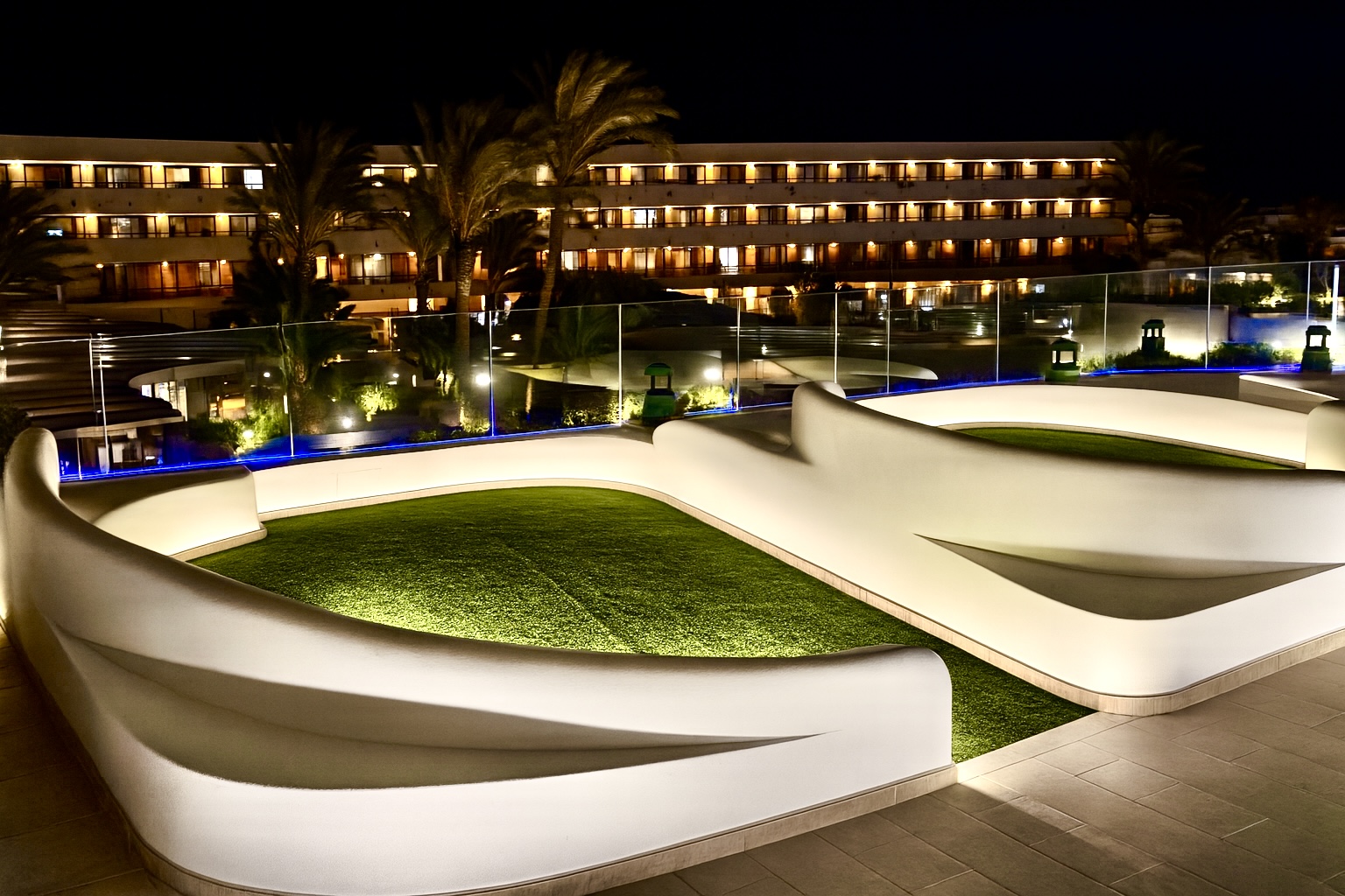 Zonas chill-out con formas orgánicas y césped artificial.