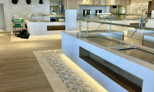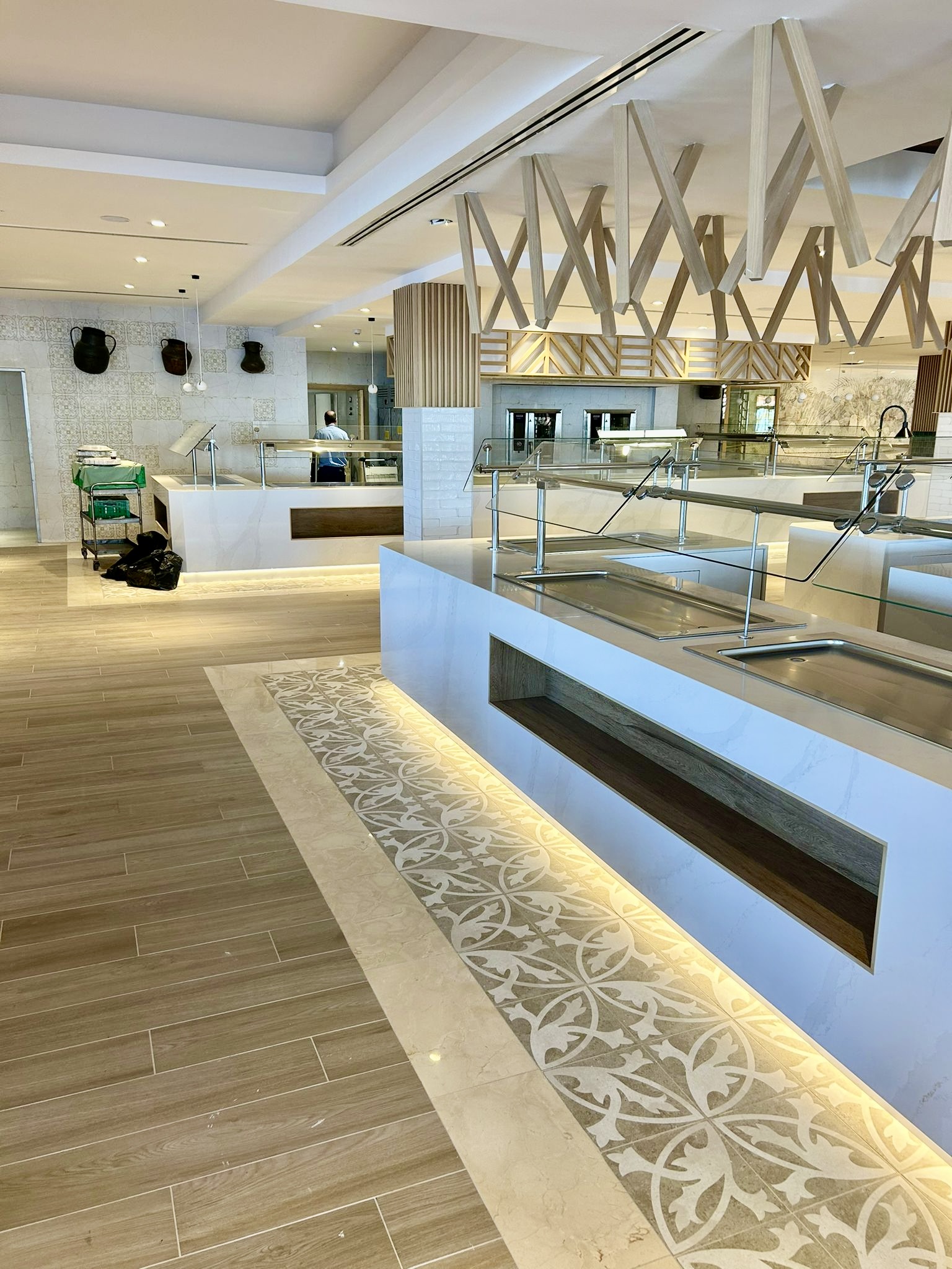 Restaurantes y buffets con estructuras modernas, iluminación indirecta y revestimientos que aportan sofisticación.